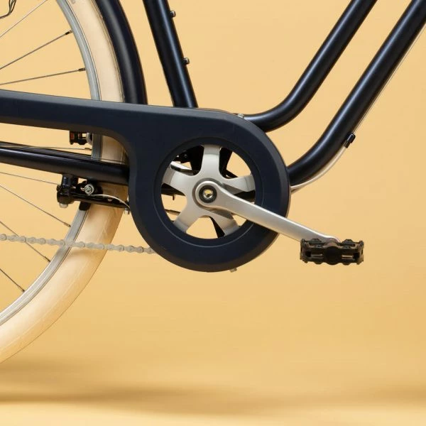 Panier avant vissé, porte-bagages arrière, éclairage par dynamo bouteille à friction, garde-boue avant et arrière, béquille latérale, carter de protection chaîne.
