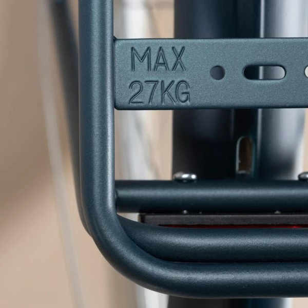 La béquille est sur la roue arrière pour ne pas gêner quand vous pédalez. Le porte bagage supporte 27 kg (c’est la norme pour poser un porte-bébé).
