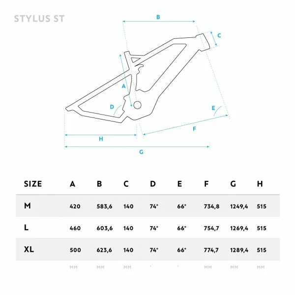 Angle de direction à 66°. Géométrie du triangle arrière à parallélogramme, conçu pour un débattement arrière de 130mm. L’intégration de la batterie est totale.