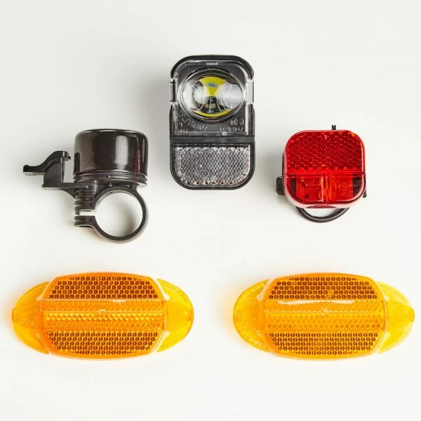 Le vélo est entiÚrement équipé pour rouler sur la voie publique : éclairage à piles, avertisseur sonore, réflecteurs de lumiÚre sur les roues (catadioptres).