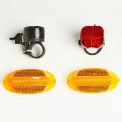 Le vélo est entièrement équipé pour rouler sur la voie publique : éclairage à piles, avertisseur sonore, réflecteurs de lumière sur les roue.