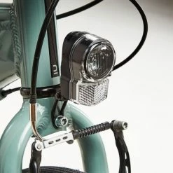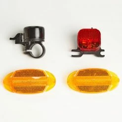 Le vélo est entiÚrement équipé pour rouler sur la voie publique : éclairage à piles arriÚre, avertisseur sonore, réflecteurs de lumiÚre sur les roues (catadioptres).
